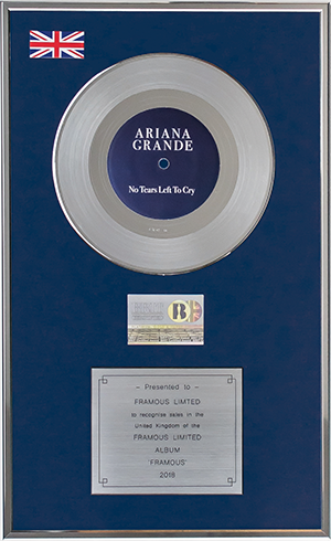Framous is licensed by the BPI (British Phonographic Industry) to make certified sales awards, carrying their logo on award plaques.